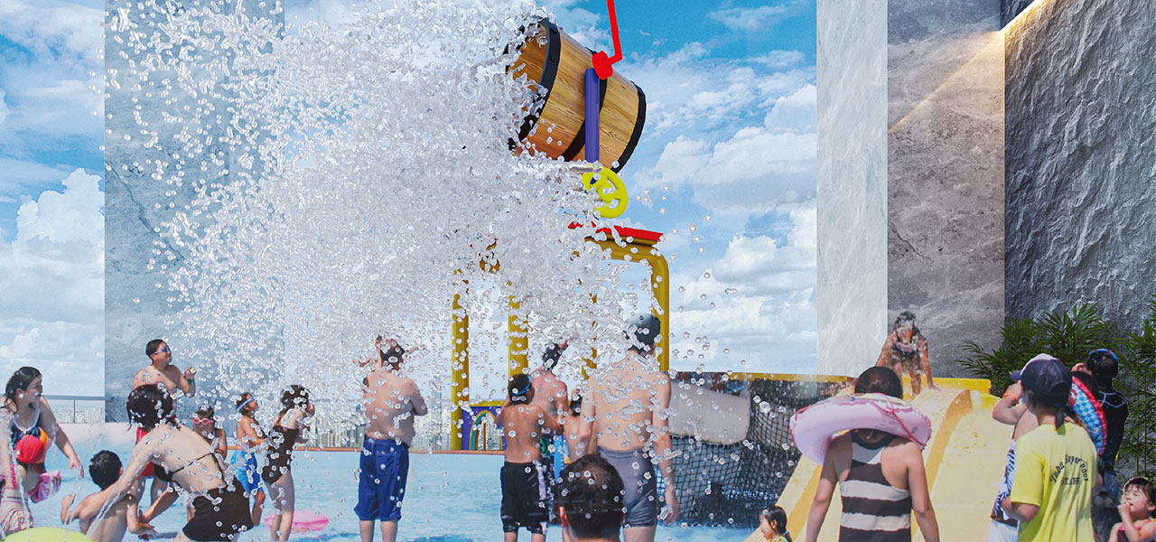 ឧទ្យានទឹកដែលមានស្លាយរំអិល និងធុងទឹកដ៏ធំនៅពីលើសម្រាប់បាចសាចទឹកនៅពេលមានទឹកពេញ។